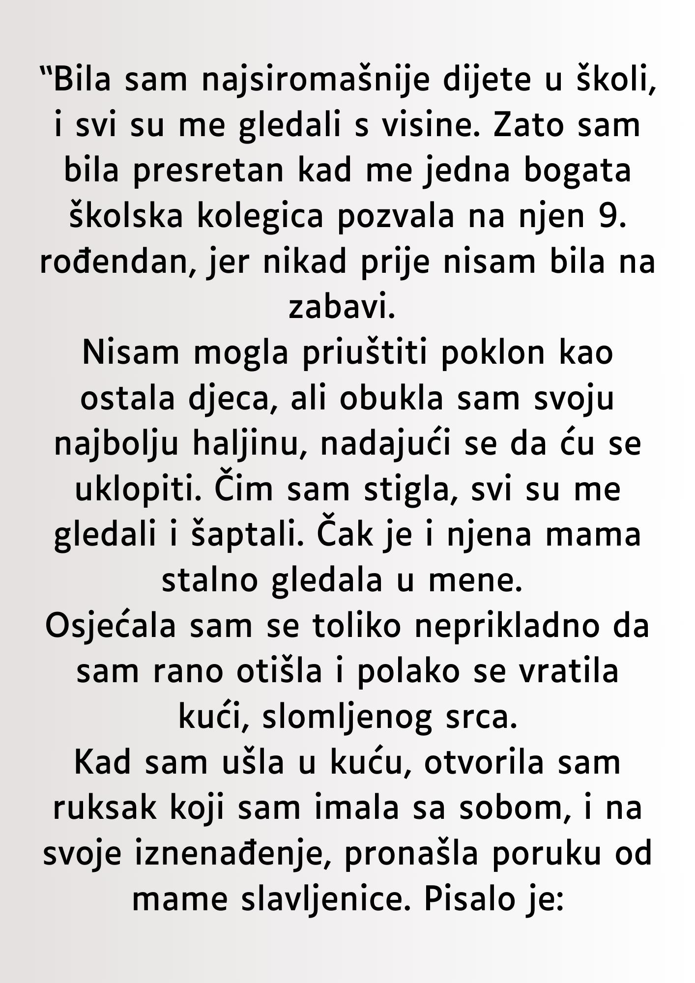 Kada se konačno vratila kući, iznenadila se kada je otvorila ruksak. Našla je poruku koju joj je ostavila majka slavljenice. Riječi su bile jednostavne, ali snažne: “Ti si nevjerovatna! Nemoj nikada dopustiti da ti neko sruši samopouzdanje. Uživaj!” Ovaj neočekivani trenutak ljubaznosti i razumijevanja od strane druge majke pružio je djevojčici osjećaj pripadnosti i vrednovanja koji je toliko nedostajao. Zbog tog djela empatije, ona je shvatila da nije sama. Ova mala, ali značajna gesta, pomogla joj je da izgradi svoje samopouzdanje, pokazujući joj da postoje ljudi koji vide i cijene njen unutrašnji sjaj, uprkos materijalnim razlikama. To je bio trenutak koji je preoblikovao njen pogled na svijet i njen odnos prema drugim ljudima.