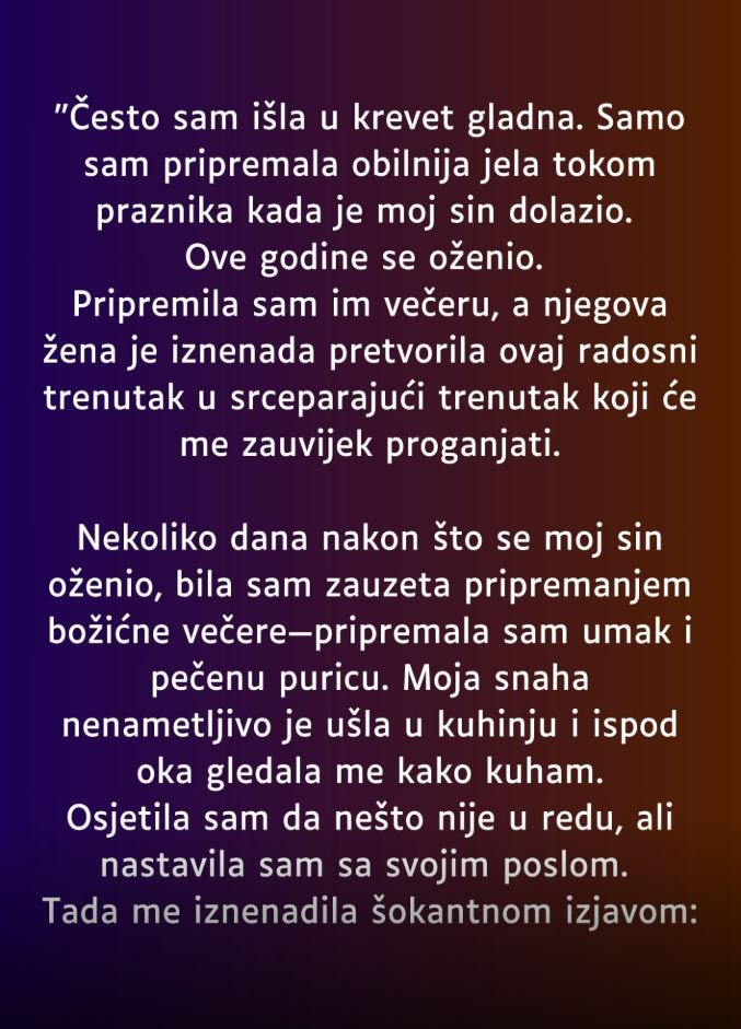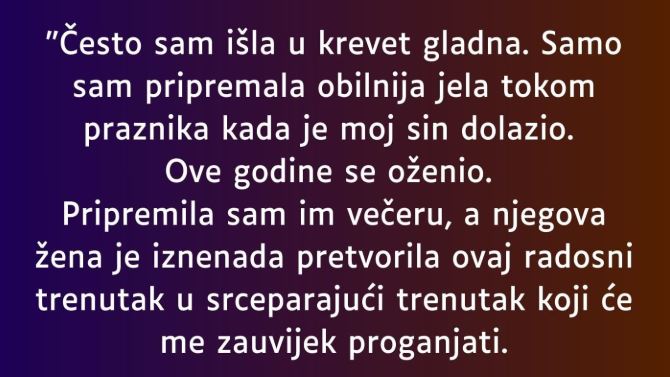 Majka je sa nestrpljenjem dočekala praznike, znajući da će njen sin, nedavno oženjen, doći u posetu sa svojom suprugom. U njenim očima, to je bio moment da pokaže koliko voli svojog sina, pripremajući obrok koji je bio više od hrane – to je bila tradicija koja se prenosila kroz generacije. Na meniju je bila pečena purica sa umakom, jelo koje je simbolizovalo toplinu doma i porodično okupljanje.