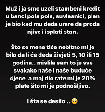 Kada parovi odluče uzeti stambeni kredit zajedno, obično postoji pretpostavka da će oboje raditi na održavanju tog odnosa, kako na emocionalnom, tako i na finansijskom planu. U ovom slučaju, žena je sa svojim suprugom dogovorila da će oboje plaćati kredit, nadajući se da će, kada dođe trenutak, prodati imanje koje je nasledio od svog dede i isplatiti stan. Bez obzira na to koliko će vremena proći, ona je bila spremna na sve izazove, misleći na budućnost njihove djece. Ova situacija daje do znanja koliko je važno imati jasno definisane obaveze i očekivanja u svakoj vezi, posebno kada su u pitanju zajednički finansijski ciljevi.