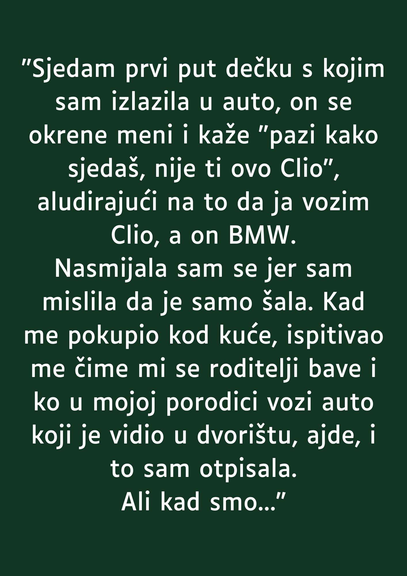 Priča počinje kada mlada djevojka odlučuje provesti veče s dečkom s kojim je nedavno započela vezu. Iako je bila uzbuđena, nije imala na umu da će taj izlazak otkriti sukobe između njihovih vrijednosti i načina na koji vide svijet. Djevojka je bila ponosna na svoj skromniji automobil, dok je njen dečko vozao skupocjeni BMW. Na prvi pogled, njegova uvreda, koja je naizgled izgledala kao šala, bila je uvod u nešto mnogo dublje. Njegov pokušaj da omalovaži njen automobil simbolizirao je njegovu nesigurnost i potrebu za superiornošću. Ovakva ponašanja često se javljaju u vezama, ali rijetko se prepoznaju odmah, što može dovesti do emocionalne štete.